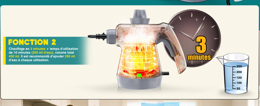 💨 Vapeur Puissante et Haute Température – Avec une puissance de 1050W, le nettoyeur vapeur chauffe en seulement 3 minutes et génère une vapeur chaude jusqu’à 135°C (275°F). Son réservoir d’eau de 440 ml (280 ml recommandés) offre 8 à 12 minutes d’autonomie. La vapeur à haute température élimine facilement saleté, poussière, graisse et bactéries – sans aucun produit chimique.